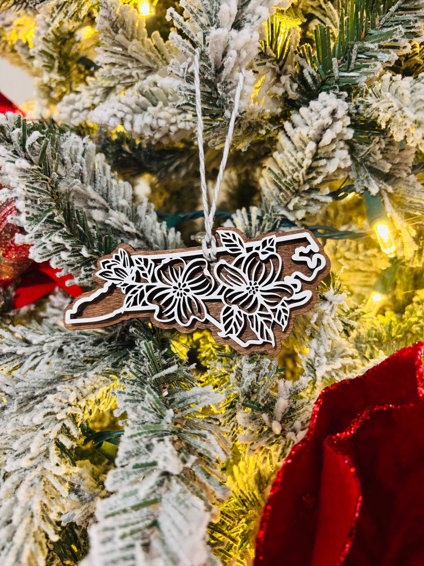 Celebrate North Carolina pride with this beautifully crafted NC-shaped ornament, adorned with delicate dogwood flowers—the state’s iconic bloom. Perfect for holiday décor or year-round display, it adds a touch of Southern charm to any home or gift.